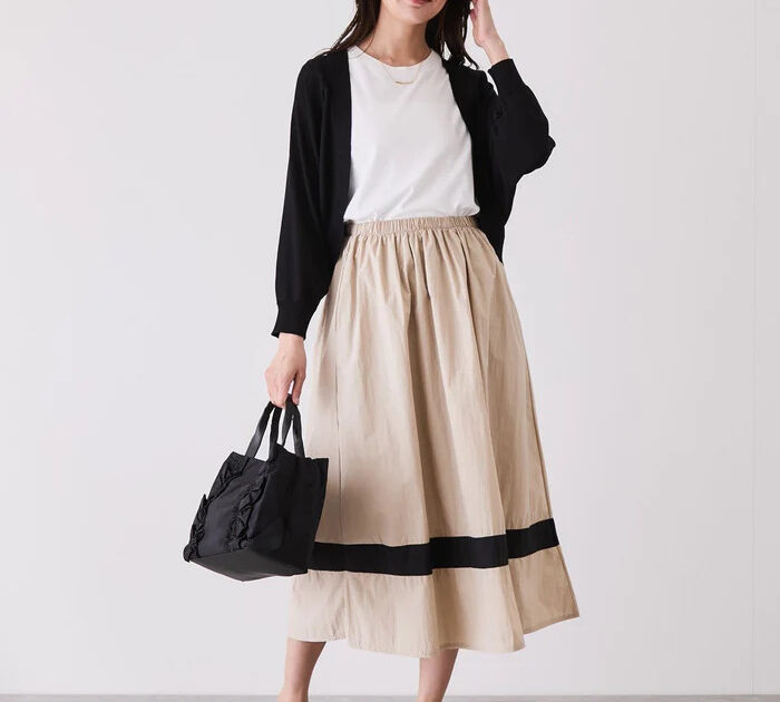 タイトすぎずゆるすぎないパンツやスカートを選ぶと、縦のラインが強調されます。