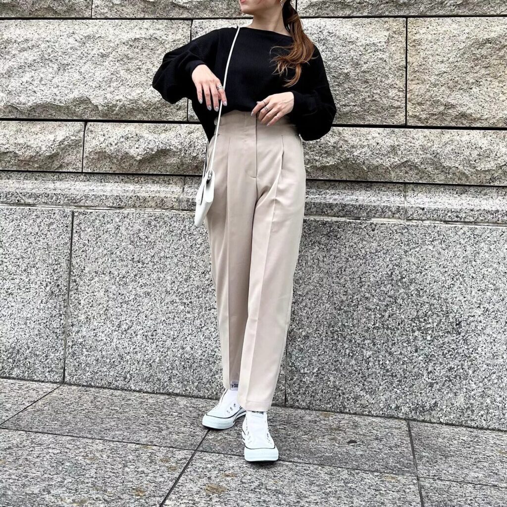 パンツの色と靴をそろえると、ラインが途切れず小柄でもバランスよく見せられます。