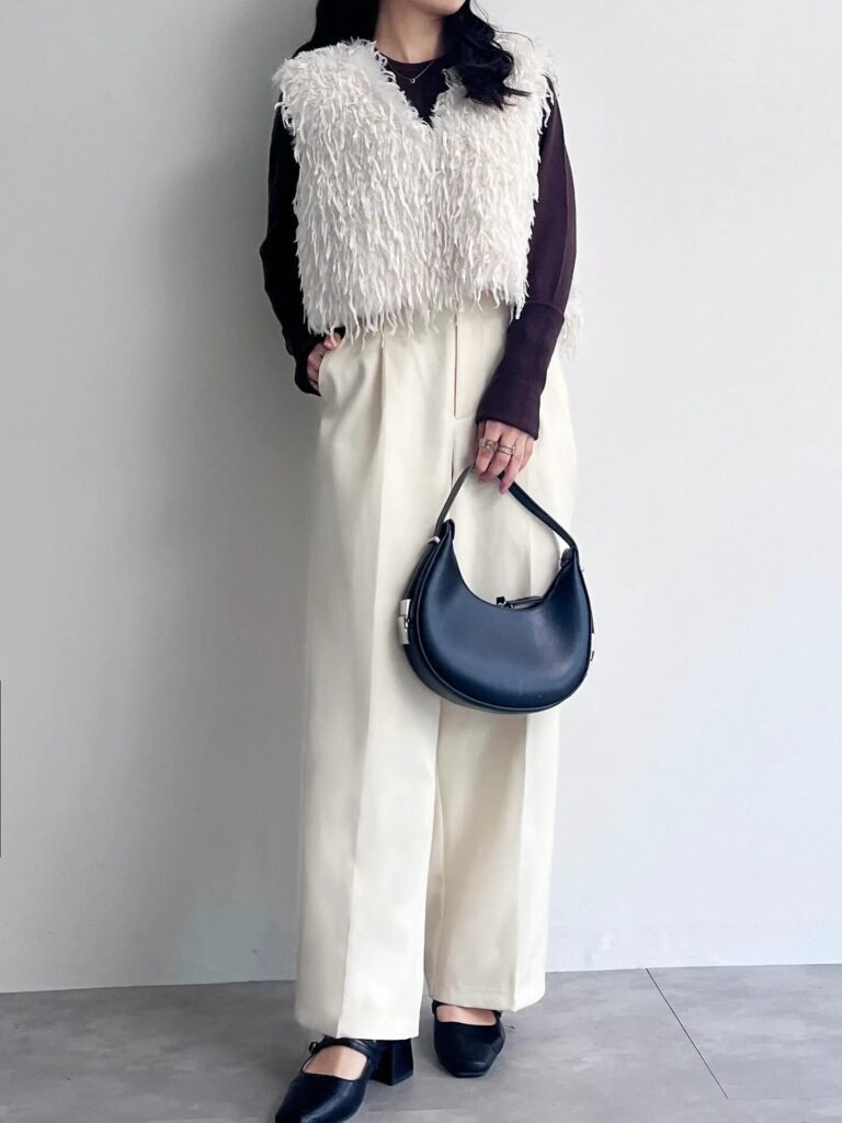また、レイヤードスタイルやアクセサリーで視線を上に集めると、自然に脚長効果やスタイルアップが狙えます。