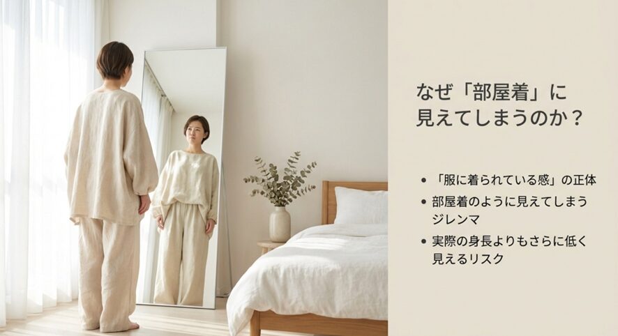 ナチュラル系のデザインは、締め付けを排除するために身幅や袖幅が広く取られています。これが小柄な体型に乗ると、余った布がシワやたわみとなり、だらしない印象や「借り物の服」のような違和感を生んでしまいます。