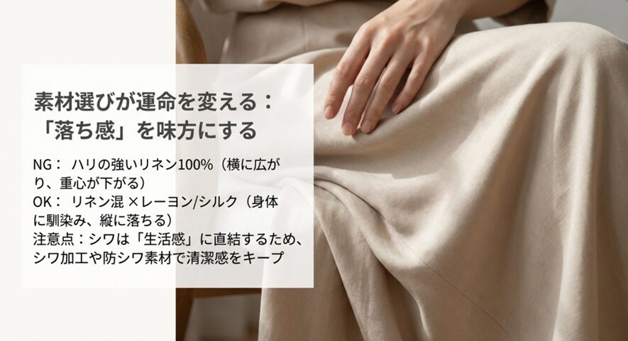 ルールは明確です。「布量を管理し、落ち感のある素材を選び、重心を上げる」。