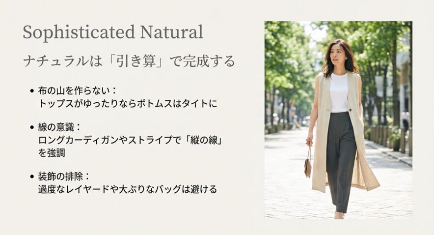 ナチュラルファッションは、アイテムを重ねることで世界観が深まりますが、小柄な女性はあえて「引き算」の思考を持つべきです。