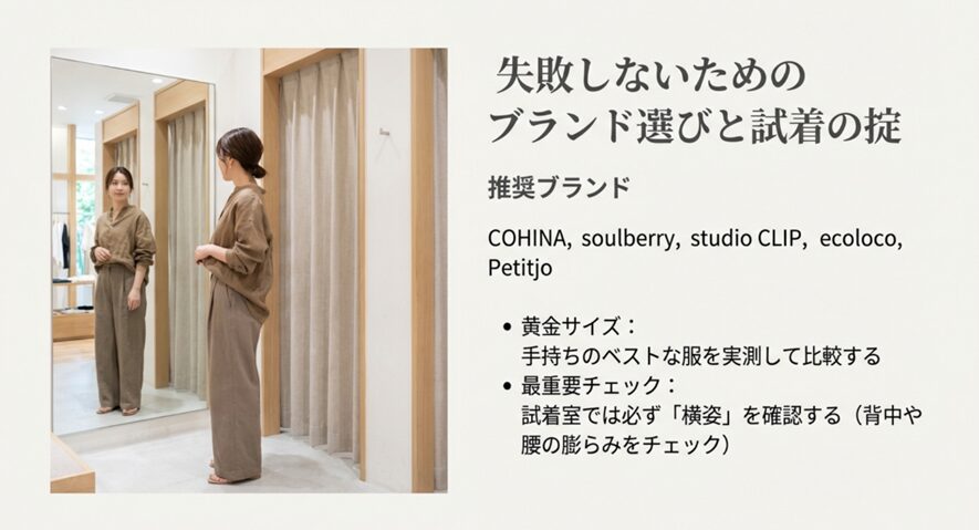 試着室の鏡の前では、ついつい正面ばかり見てしまいがちですが、ナチュラルファッションで重要なのは横からのシルエットです。布が背中や腰回りで余分に膨らんでいないか、横から見て「身体が大きく見えていないか」を厳密に確認しましょう。もし膨らみが気になる場合は、素材をよりしなやかなものに変えるか、サイズを一段落とす勇気が必要です。
