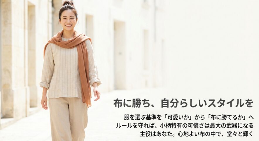 小柄な女性がナチュラルファッションを自由に楽しむためには、確かにいくつかのハードルを越える必要があります。無造作に着るだけでは、布の重みに負けてしまうからです。