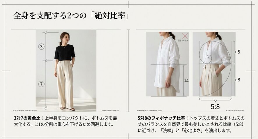 さらに高度なテクニックとして、トップスの着丈とボトムスの丈のバランスを「5対8」のフィボナッチ比率に近づける手法がありま 。これは自然界で最も美しいとされる比率であり、これをコーディネートに取り入れることで、見る人に無意識の「心地よさ」と「洗練」を感じさせることができます。