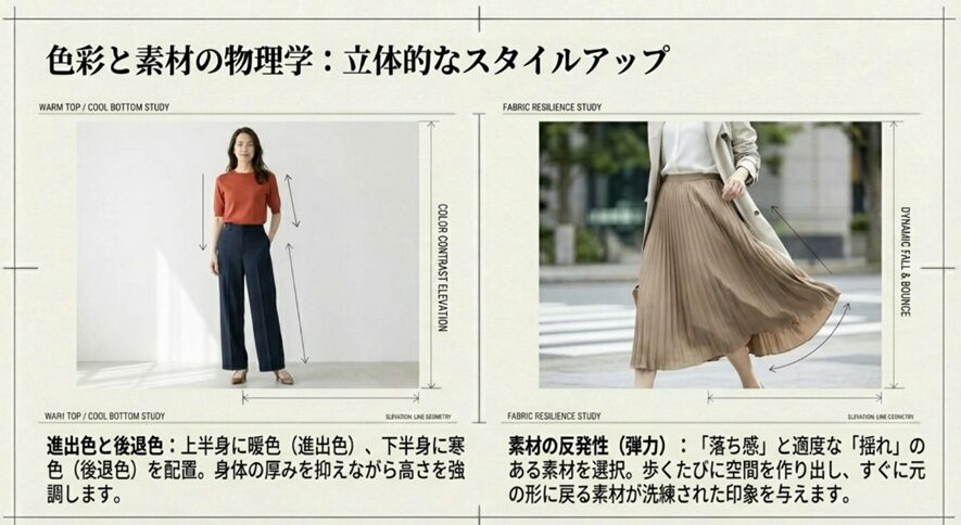 小柄な女性が上半身に進出色、下半身に後退色を配置すると、上半身に力強い存在感が生まれ、下半身はスッキリと遠のいて見えるため、結果として身体の厚みを抑えながら高さを強調する「立体的なスタイルアップ」が可能になります。
