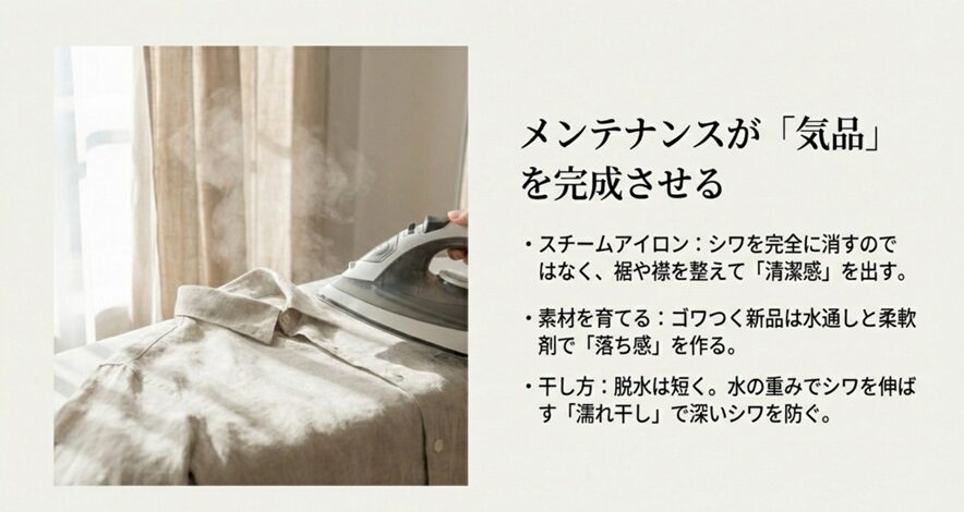 ゆったりとした服、特に天然素材は、シワがそのまま「だらしなさ」に直結します。