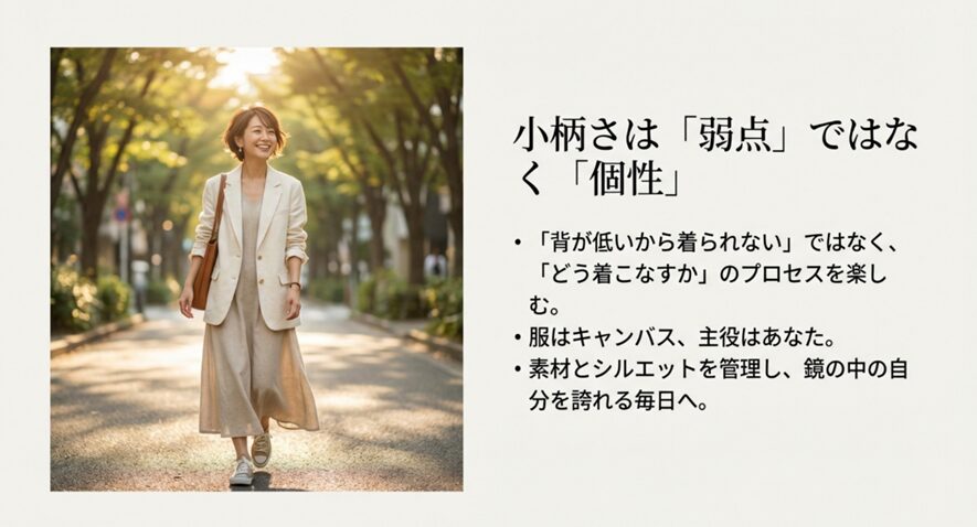 「背が低いから、これは着られない」と諦めるのではなく、「どうすればこの心地よい布を、私に合わせて昇華できるか?」と考える。その試行錯誤のプロセスこそが、ファッションの醍醐味です。服に負けるのではなく、あなたが主役です。