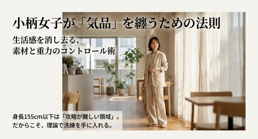 素材の「物理的な管理」と「視覚的な重力操作」を知ることで、小柄な女性は「布に負ける」のではなく、素材の風合いを味方につけて、洗練された「気品」を醸し出すことができます。