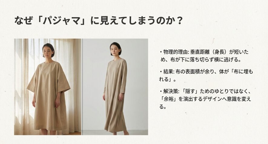 すべての服には「表面積」が存在します。高身長の人の場合、垂直方向の距離があるため、布が自重によって下へと引っ張られ、適度なドレープ(ゆらぎ)が自然に生まれます。しかし、小柄な女性の場合、この垂直距離が短いために布が下に落ち切らず、余った分量が「横」へと逃げてしまいます 。これが、ゆったりした服を着たときに「横太りして見える」最大の物理的原因です。