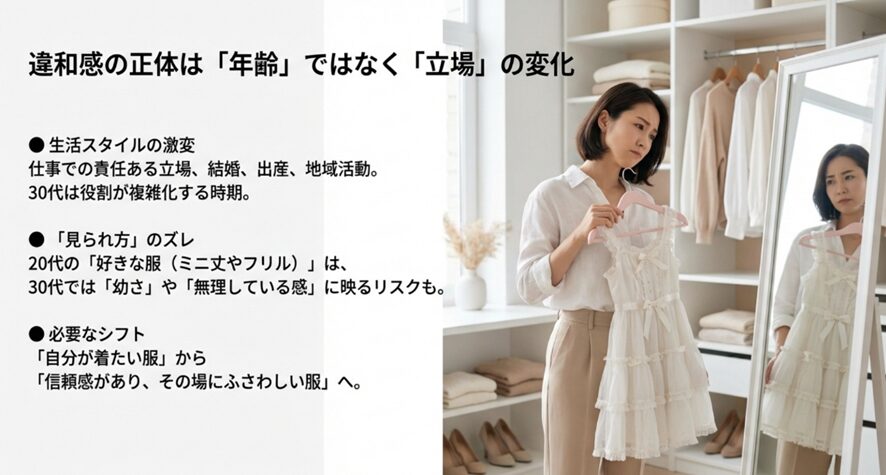 30代になって、クローゼットの前で立ち尽くす時間が増えたと感じていませんか。昨日まで着ていたはずの服が、鏡の中の自分と調和していないような感覚。その理由は、決して年齢そのもののせいではありません。