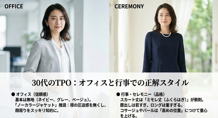 卒園式、入園式、あるいは親戚の集まりなど、30代はセレモニーの機会も増えます。こうした場では、トレンドを追うよりも「しっかりとした大人」としての信頼感を演出しましょう。