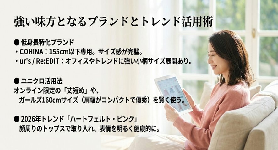 理想のスタイルを実現するためには、どこで服を買うかも重要な戦略です。最近は小柄女性専用のブランドも増えており、選択肢が広がっています。